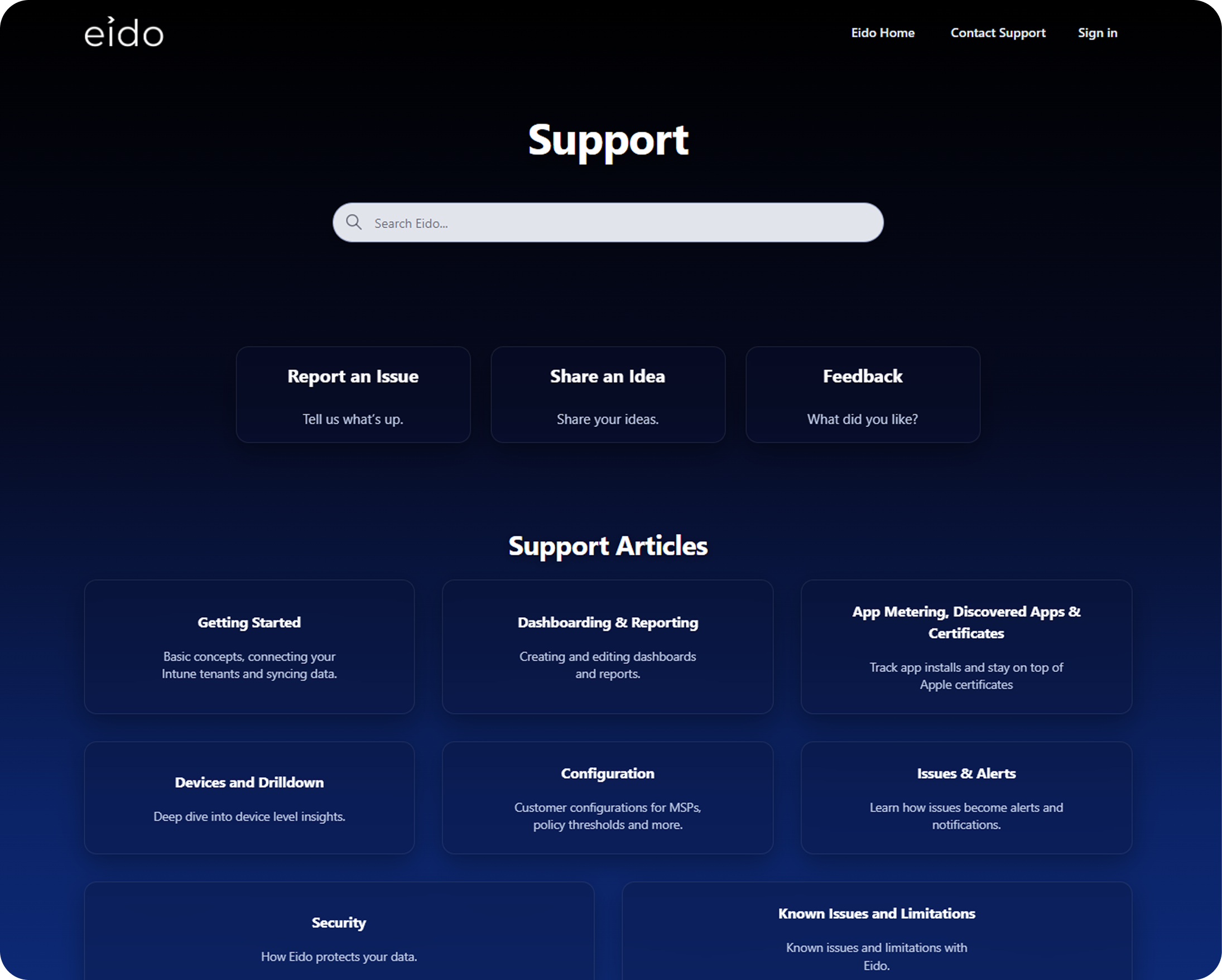 Our Knowledge Base contains full documentation to help you get started and get the most out of Eido. If you can’t find the answer you’re looking for, you can easily reach out to our support team using the messaging button in the bottom corner of the Knowledge Base.